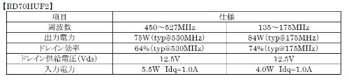 新製品の特長 1.高出力で高効率 ・RD70HUF2:UHF 帯75W、VHF 帯84W の高出力で、50W 級業務無線機に対応