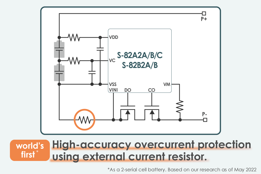 2-serial cell battery protection ICs using an external current detection resistor to deliver high-accuracy overcurrent protection not easily susceptible to battery voltage and temperature fluctuations.