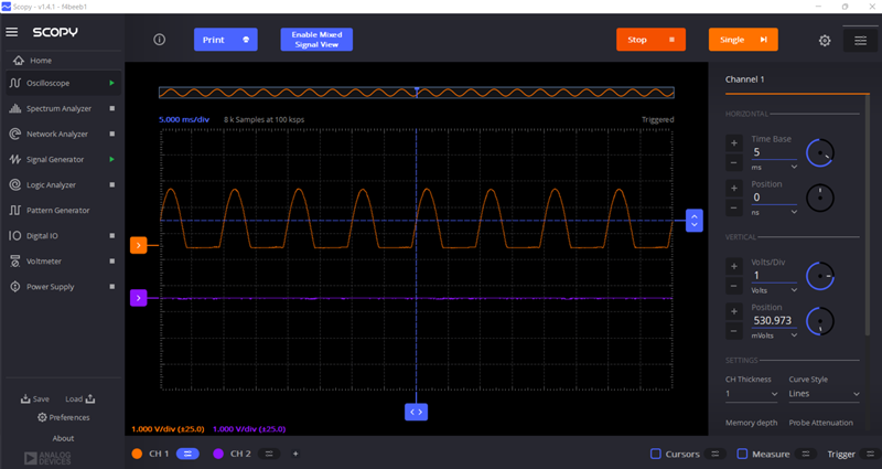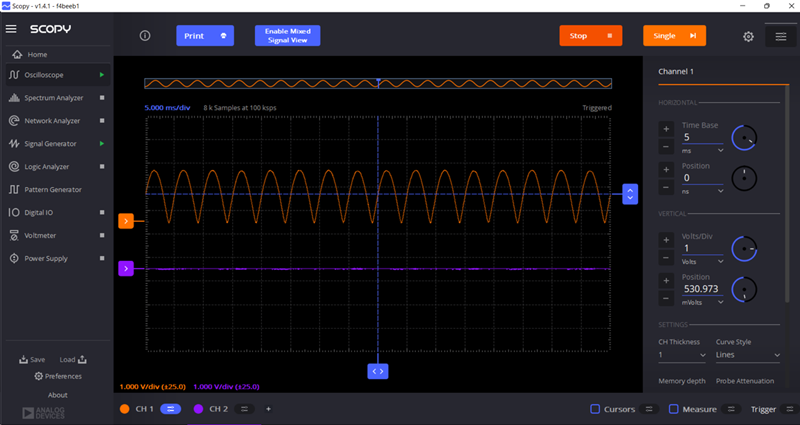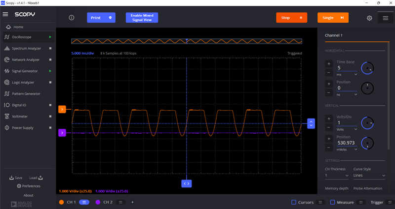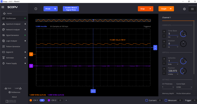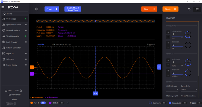 ADALM2000は、入力12ビット、30MSPSのスピードでサンプリングできるADC部分と50Mbpsで出力可能なDAC部分を搭載している手のひらサイズの計測器です。