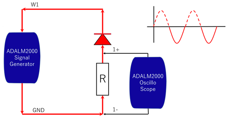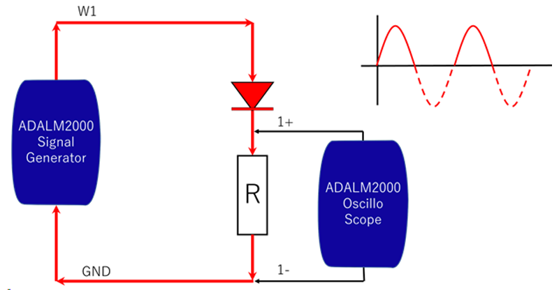 この回路に交流の信号を入れると、+側の半分だけの電気が取り出せます。