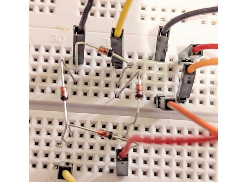 このブリッジ回路を実際に組むと、図10のようになります。(ダイオードの向きに注意)