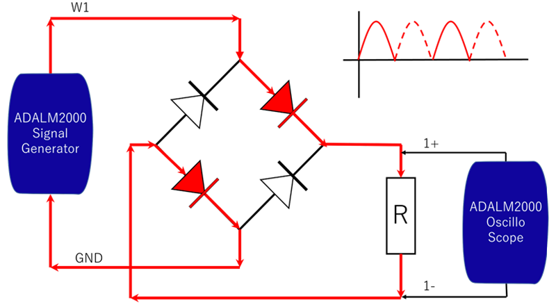 このポイントは、ブリッジ回路にある真ん中を基準点として計測しているため、図13の全波整流(+側)された波形を観測することができます。