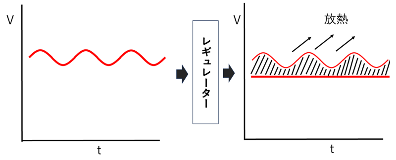 リニアレギュレータは、ここまで説明してきた回路説明そのものです。平滑化回路から得られた電圧は、まだ交流成分(リプル)が乗っているため、図のような電圧になっていますが、リプルを発熱という形で外部に逃すことで、より安定した電圧を得る工夫をしているます。
