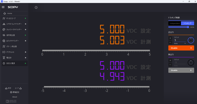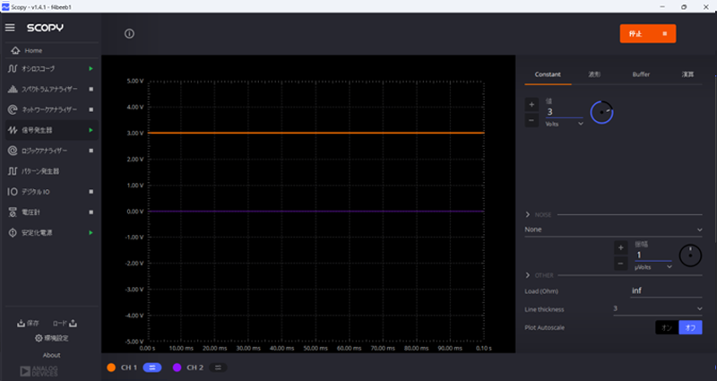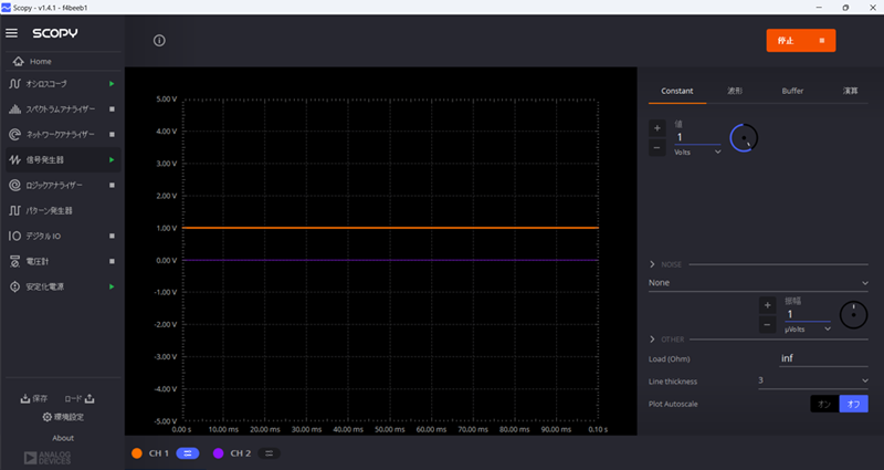 リファレンス電源には、ScopyのSignal Generatorから直流1Vを指定しておきます。