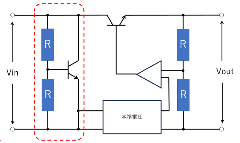 保護回路は、調整部から出力された電圧に直列で抵抗を入れることで、電流を調整する機能です。その電流は、監視用トランジスタに接続されているため、調整部のトランジスタに流れ込む電流を調整することで、保護回路として機能します。(図15)
