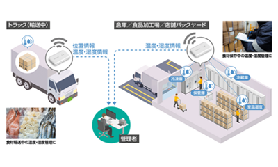 トラック荷室内の温度・湿度をセンサービーコンで、トラックの位置をGPSで検知して、輸送状態を把握。倉庫/食品加工場/店舗バックヤードでは室内や冷蔵倉庫等の温湿度データを集約して管理できます。
