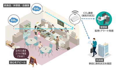 飲食店/休憩室/会議室など人が集まりやすい場所のCO2濃度を計測し、換気の状態を「見える化」できます。換気状況が悪化した際は、換気を促進、密集を避ける表示やメールなどでアラートを通知することができます。
