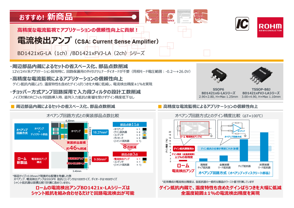 近年、多くのアプリケーションで電流検出の要望が高まっています。例えば、モータの効率改善、異常検知などを実現するためには、高精度な電流検出が必要です。また、同時に実装面積削減も要求されます。従来構成(オペアンプ+ディスクリート部品)では、部品の精度ばらつきや温度特性による電流検出精度悪化、実装面積の確保が課題でした。 今回ロームでは、これらの課題を解決するため、今まで培ってきたアナログ技術により、省スペースかつ高精度で電流検出が可能な、新製品「BD1421x-LAシリーズ」を開発しました。