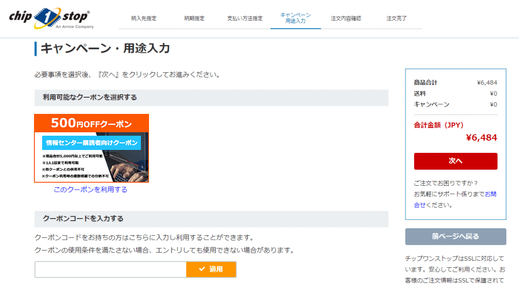 - ご購入手続き中の「キャンペーン/用途入力」画面でクーポンを選択してください。